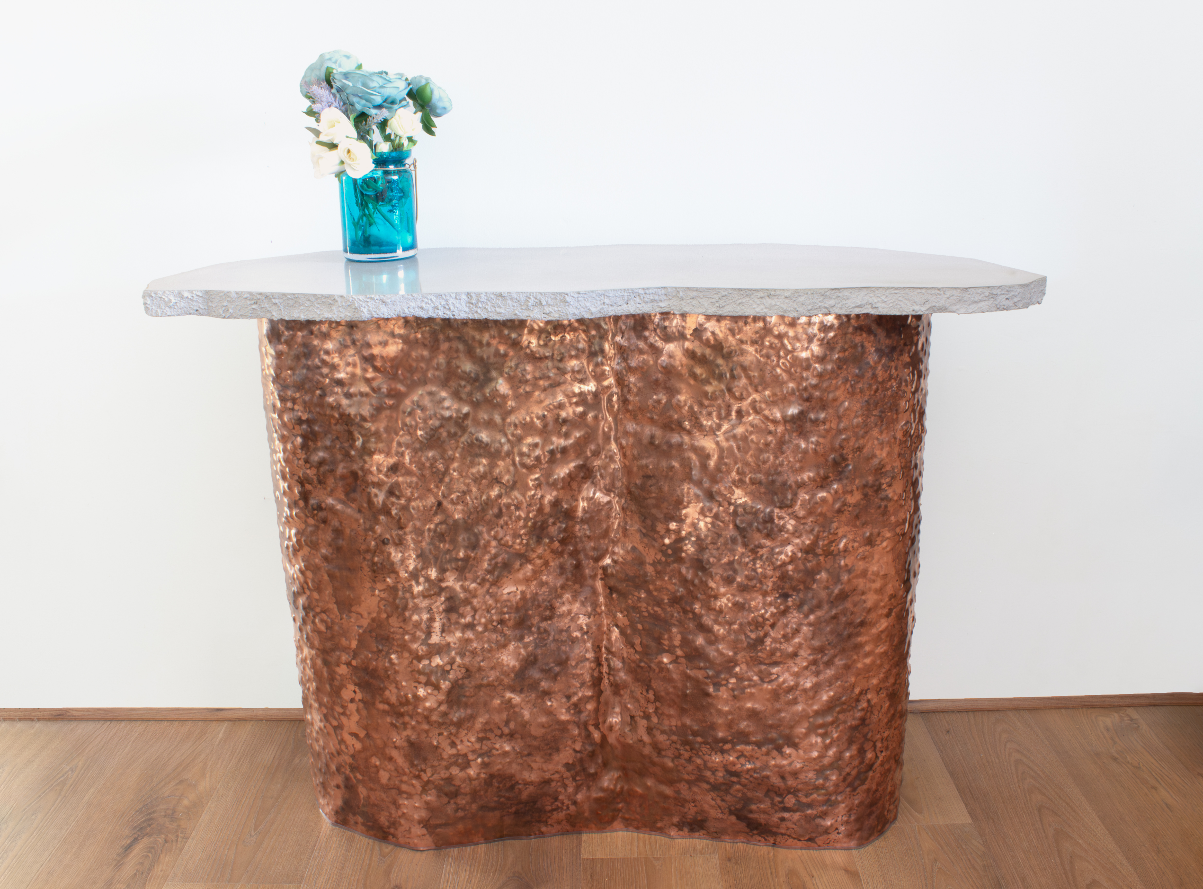 The copper base is hand-bent and hammered to represent the collisions that occur in the formation process whilst creating a flowing, organic form. The patinated copper showcases the long timescale over which these events take place, while also celebrating the copper’s natural colours and beauty.